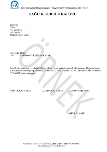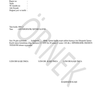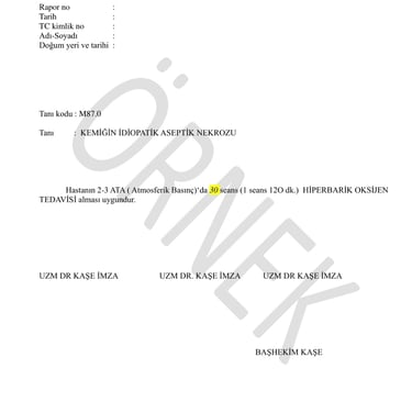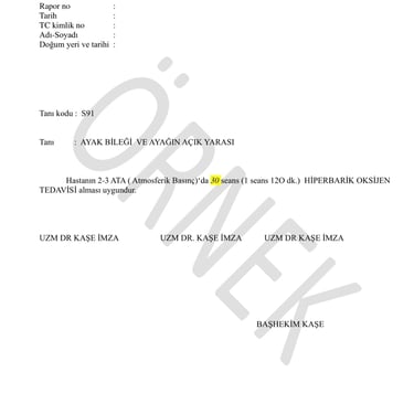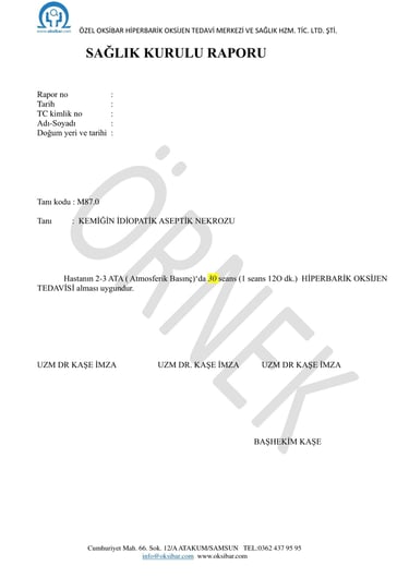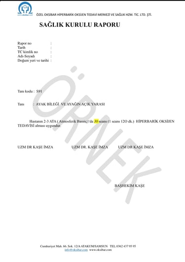 Raporda ICD tanı kodu ve tanının tam ismi, 2-3 ATA basınç aralığında 1 seansı 120 dakika olacak şekilde ifadesi ve tanıya göre uygun seans sayısı mutlaka belirtilmeldir.